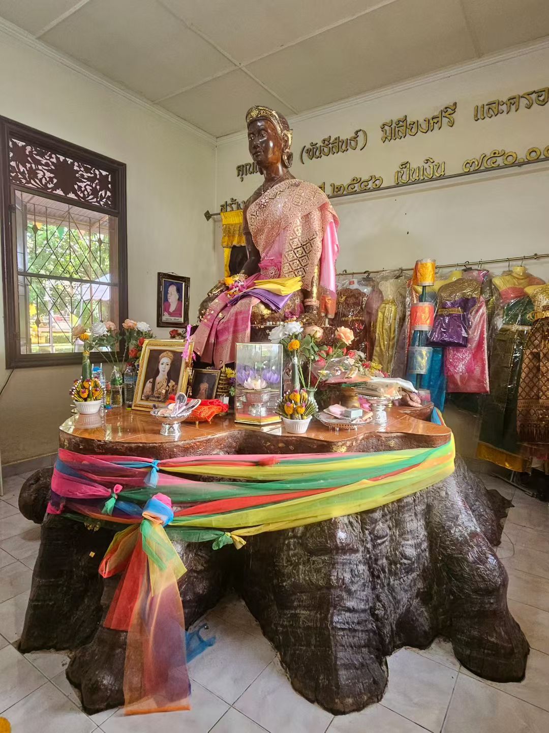 這棵“特 Khan”樹自寺廟建立以來,守護寺廟超過400年,成為寺廟著名的吉祥象徵。1997年,大樹突然倒塌,高僧“龍普”為助女神完成修行,在樹樁上雕刻“周咩特 Khan”形象,供信眾參拜。據說,許多參拜者的祈願幾乎都能實現。當地傳聞,不少佩戴聖物的信眾家中遭遇小偷時,聽到一女子低聲喝止竊賊。
